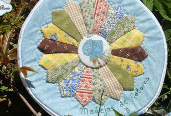 Sobre fondo azul (el color favorito de María José) decidí hacer un plato Dresden que tan bien combina con la forma redonda de la funda. Y para el centro, la muñequita Holly Hobbie que María José eligió como símbolo de su blog. La misma tela la reservé para la parte de atrás con un acolchado a rombos.