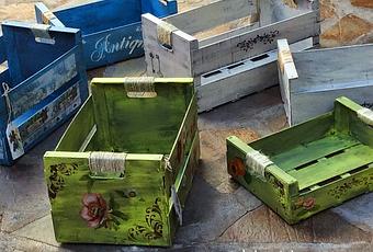 Para dar y tomar! Qué contenta estoy con mis cajas de frutas recicladas! Bueno, mis no, porque ninguna de estas cajas son para mi. Les cuento, hice dos cajas para mi y a mi gente le gustaron tanto que todos querían, así que venga a buscar cajas en las fruterías.... Y a reciclar! Pintura chocolate de base y colores distintos encima, transfers, decoupage, stencils,...de todo!!!En blanco