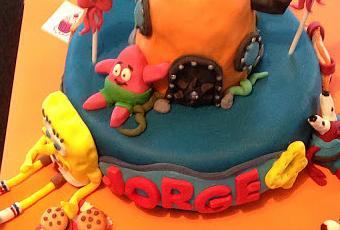 Cuando me encargaron esta tarta para el 4º cumpleaños de Jorge, me entró un poco de mieditis. Tenía que ser una tarta de Bob Esponja, pero no una tarta de Bob Esponja cualquiera ¡¡¡noooooo!!! Jorge quería una tarta con la casa de Bob Esponja y sus amigos...