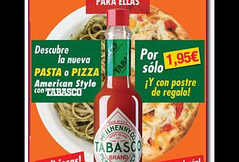 Pues desde ayer día 17 hasta el 30 de Junio podrás probar en todos los locales de PIZZA JARDÍN la nueva pasta o pizza American style con Tabasco por sólo 1,95 € y además con postre de regalo a elegir entre los existentes en la carta de postres de PIZZA JARDÍN.