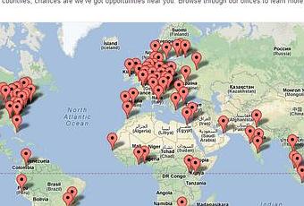 En ese mapa, cada país que tiene oficinas posee una marca en el mapa y haciendo clic en alguna de ellas, van directamente a la página local. En la parte superior de la columna de la derecha de esas páginas tendrán una lista de las posiciones ofrecidas..