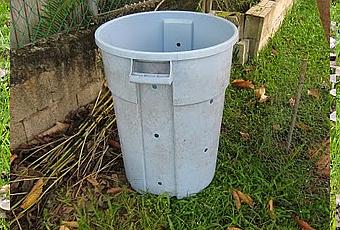 Estoy tan contenta con lo lindas que crecen las plantas cuando al terreno se le añade composta, que ya no me basta con el envase de 10 galones dónde la preparo. Ahora tengo uno más grande. Conseguimos un envase de 55 galones que teníamos con tereques, lo llenamos de agujeros y listo.