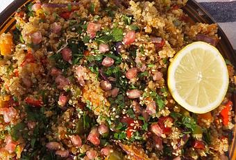 7. Emplata y decora con perejil fresco picado, granos de granada y semillas de sésamo. Echa un poco de aceite de sésamo sobre la quinoa.