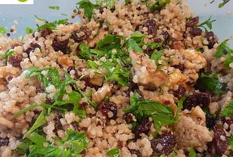 Cuando la quinoa esté lista, escurrirla bien y verterla sobre las nueces o piñones. Añadir las pasas. el zumo de limón, el aceite y el perejil y mezclar todo bien. Salpimentar al guasto y servir.