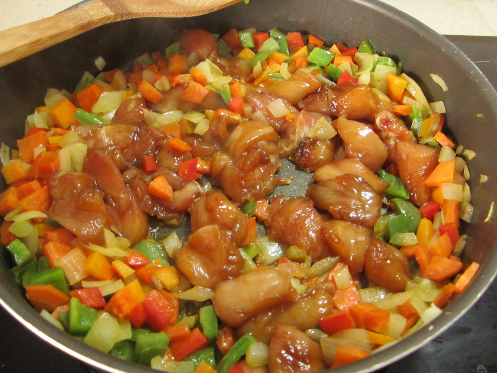 Añadimos el pollo y salteamos hasta que quede bien hecho.