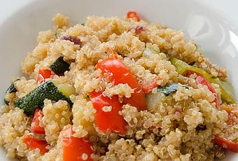 Ingredientes- 1 taza de quinoa- 3 tazas de agua.- 1 calabacín.- 1 pimiento rojo.- 1 pimiento verde.- 1 cebolla morada.- Aceite de oliva.- Pimienta.- 1 cucharadita de postre de salsa de soja baja en sodio.