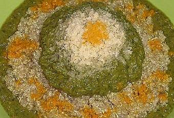 Cuece la quinoa previamente lavada y escurrida en una cazuela con caldo vegetal hirviendo durante 15 minutos .Mezcla en la batidora el resto de ingredientes y bate hasta obtener una mezcla homogénea ( sin grumos ).Calienta la mezcla anterior en un cazo a fuego medio y déjala hervir 10-15 minutos .Sirve la quinoa cocida y escurrida y mezclada con la crema de espinacas ( cantidad al gusto ) y si los usas espolvoreada con la cúrcuma y la levadura de cerveza en copos .