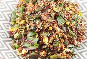 Por último, incorporamos a la sartén las hojas de remolacha, la quinoa roja y las pipas de calabaza [o cualquier semilla que queramos utilizar] y lo salteamos dos minutos para que todo el conjunto se integre y coja temperatura.
