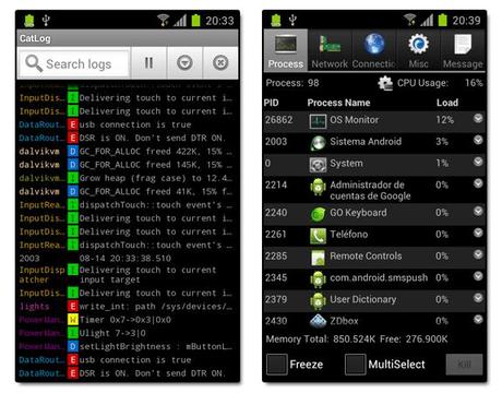 Si los anteriores métodos no han funcionado, queda una última posibilidad de detectar la app que está mostrando los anuncios. Se trata de utilizar dos aplicaciones: CatLog y OS Monitor. La primera es un visor del logcat (registro de logs) del dispositivo. En él se refleja cualquier operación que se lleve a cabo en nuestro terminal. Una vez nos aparezca el anuncio en la barra de notificaciones, abrimos el CatLog y guardamos el registro actual en un fichero de texto. En este registro podremos buscar el texto del anuncio y extraer el PID (un número que identifica la aplicación que ha creado el anuncio).