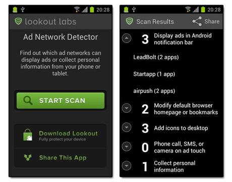 Un tercer método, si los anteriores se nos resisten, es instalar el Lookout Ad Network Detector, que muestra las aplicaciones según las distintas acciones que es capaz de realizar:- Mostrar anuncios en la barra de notificaciones.