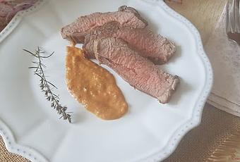 - Servimos la carne fileteada con unas cucharadas de salsa. Nuestro acompañamiento favorito es ensalada y patatas asadas.