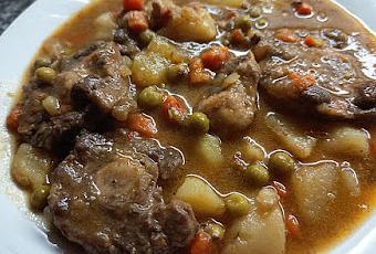 2 kg de rabo de ternera2 zanahorias3 dientes de ajo2 cebollas medianas2 tomates maduros o sofrito de tomate3 o 4 patatas1 pimiento verde1/2 pimiento rojoUn puñado de guisantes2 hojas de laurel2 ramitas de tomillo2 vaso de vino tintoCaldo de carneHarina para rebozarAceite de olivaPimienta molidaSalElaboración:Salpimentar los trozos de rabo y enharinar ligeramente.Poner una cazuela plana con aceite a calentar y dorar la carne por los dos lados. Retirar y reservar.