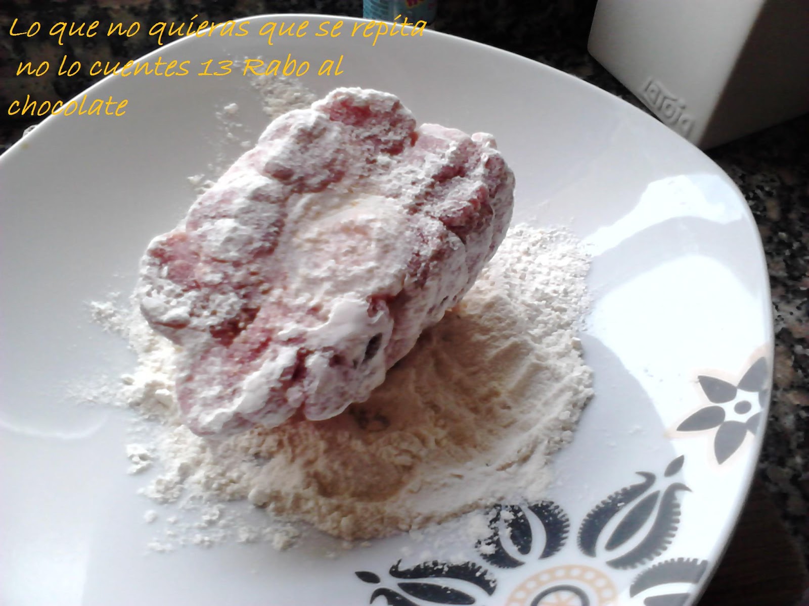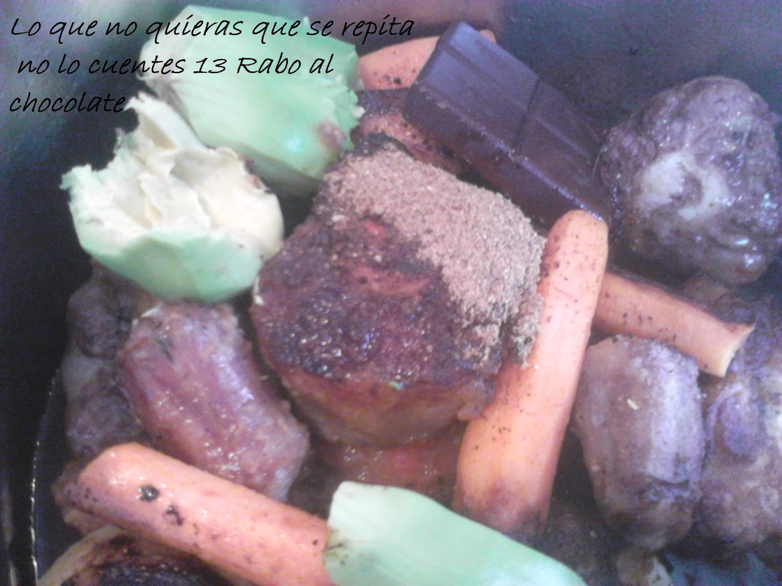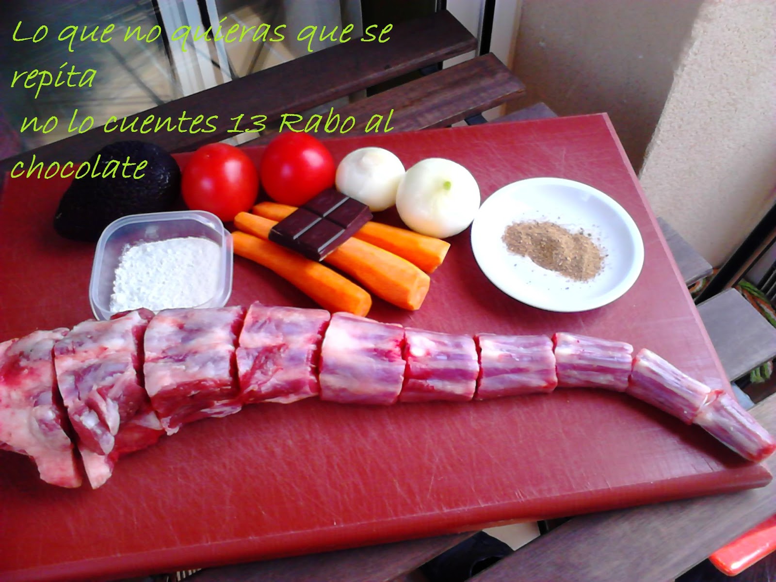 Ingredientes 3/4 pax1 rabo de ternera, en este caso3 zanahorias grandes2 tomates maduros grandes 2 cebollas40 gramos de chocolate 70% cacao1 aguacate2 cucharadas soperas de harina de trigo1 cucharada rasa de setas secas molidasSal PimientaAceite de oliva virgen1 litro de agua o caldo suave de carne1 chorro de brandy de Jerez