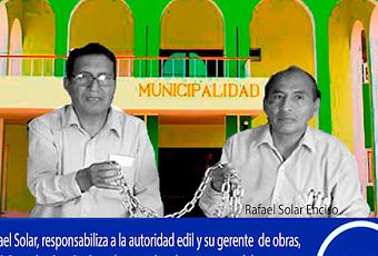 Desde el programa de televisión “Lima sur noticias” que se transmite por Activa Tv, Solar-dijo que no tendría problema alguno para encadenarse en el frontis del municipio en señal de protesta contra una gestión tan cuestionada y venida a menos.Expresó que Pariona Lizana y lo que tiene por funcionarios – están impidiendo el desarrollo de la otra Capital Comercial de Cañete – dejando entrever no es posible hoy hablar de un gobierno transparente sin requerir una rendición de cuentas clara y precisa por parte de quienes laboran en la gestión pública.