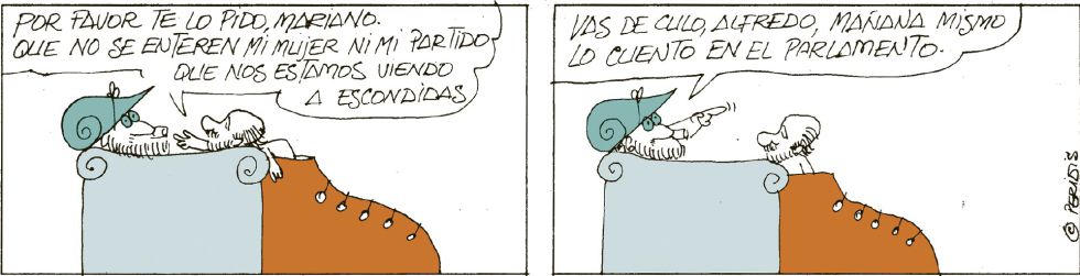 En el segundo, el presidente Rajoy, presidiendo la Moncloa, evita hablar, colándose por la puerta trasera del Senado.