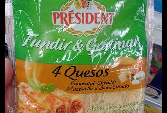 El "rallado de 4 quesos" de Carrefour "enriquece" su producto con almidón de patata (E-1422), el colorante E-160b, y los conservantes E-202 y E-280 (ácido propinóico). Este último tiene, además, un olor fuerte y desagradable. Según Food Info: "Algunas veces es hallado en altas concentraciones a consecuencia de la actividad de las bacterias en los alimentos fermentados, como por ejemplo, en ciertos tipos de quesos suizos. También es producido en grandes cantidades por las bacterias del intestino grueso, siendo además, un componente natural del sudor". Podíamos denominarlo, por tanto, como un aditivo pestilente.