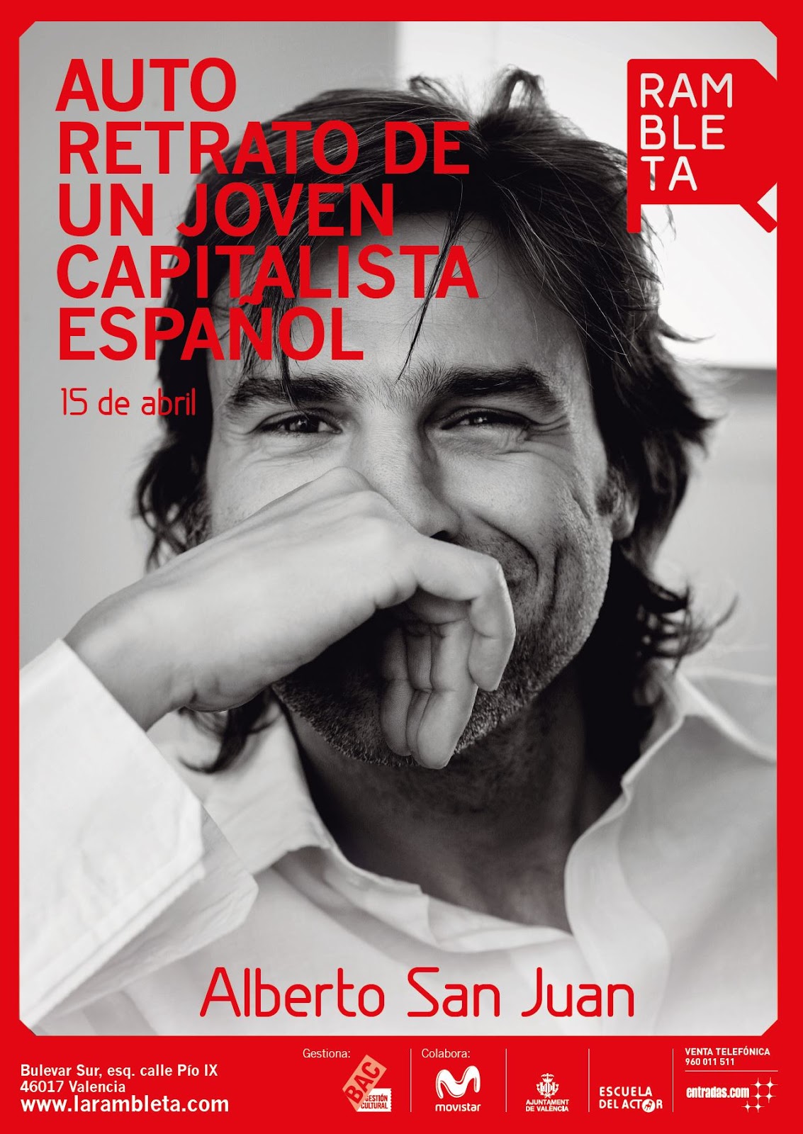 Este Viernes 15 de Abril, el Teatro de La Rambleta, acogerá el unitario "Autorretrato de un Capitalista Español", en el que Alberto San Juan desempeña el papel de autor, guionista y director.Durante esta obra, el actor hará una crítica, con toques de humor y política, sobre cómo llegamos a la situación económica actual por la que está pasando el país. Puedes comprar tu entrada desde 15€ aquí: http://www.entradas.com/Entradas-autorretrato-de-un-joven-capitalista-valencia.html?affiliate=EES&doc=artistPages%2Ftickets&fun=artist&action=tickets&key=1600833%247491631&jumpIn=yTix&kuid=519077&from=erdetaila