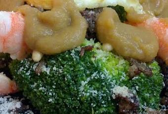 Montamos el plato colocando en la base el brócoli, repartiendo por encima la morcilla y colocando los langostinos pelados de pié apoyados. Espolvoreamos con el parmesano, colocamos en el centro el huevo, regamos con la vinagreta y podemos decorar con unos piñones.