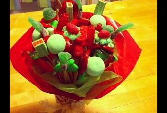 Un ramo de gominolas. Os aconsejo no elegir las chuches al azar y pensar los colores que queréis utilizar. Hay miles de chuches y a cual más rica.. En este caso rojo y verde. En casa no tenía un jarrón así que me apañé con un simple tarro de cristal y como tampoco me quedaba cintas de colores, usé una simple cuerda. Le da un toque rústico ¿no? Tiempo de preparación: 15 minutos.