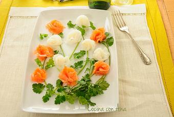 El salmóm me gusta mucho y queda muy bonito con forma de flor, ya sea sobre un cous-cous, sobre blinis o también sobre una lámina fina de tomate o salmorejo...de cualquier forma queda muy rico, y por eso se me ocurrió hacer flores y disponerlas en el plato en forma de ramo de flores...¿a que quedó bonito? a mí me gusta mucho y he pensado que quizá sea mi entrante para la cena de nochebuena.