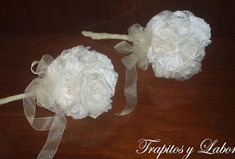 Me pidieron que hiciera un ramo de novia y estos ramos de tela siempre me han encantado así que manos a la obra Hice flores de varios tipos, luego forré los tallos con lazo de organza , los cosí a las flores, les puse unos abalorios de strass pegados con silicona , por último forré todos los tallos juntos y le hice varias lazadas con la cinta de organza .