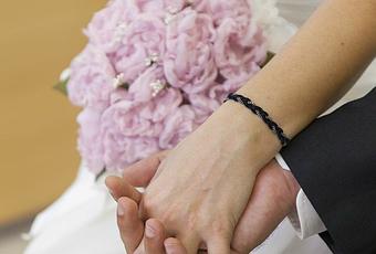 Alicia con su ramo de novia de tela confeccionado por Blanca Blanco