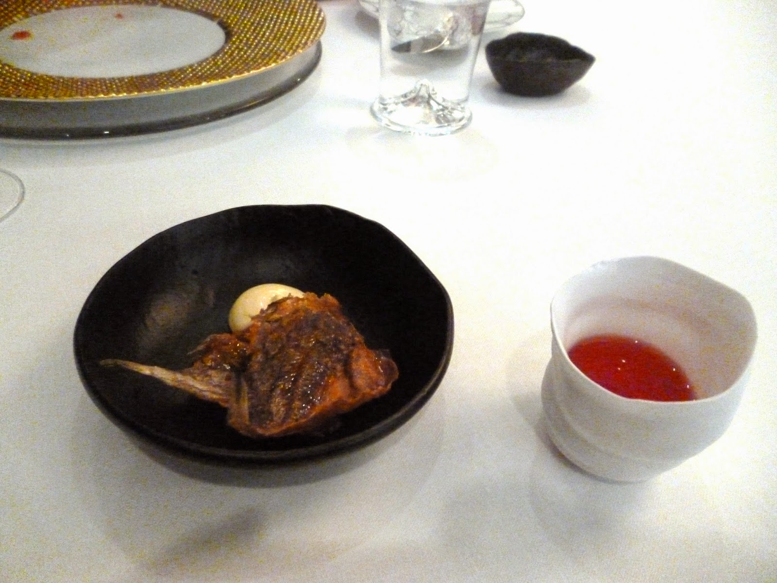 - Y de los últimos entrantes, según el menú que nos entregaron, hay un plato que se llama "Piedra y papel", pero que nunca llegó; "Fósil de pescado", una especie de sardina seca con mayonesa, que aunque nos aseguraron que era casera, a mi me sabía a "Musa", la que se comía toda la vida en casa de mis abuelos y "Cosmo-soda water", una bebida color oraldine y que a mi parecer no combinaba con el pescado. Quedaba raro, sobre todo teniendo aún la bebida del aperitivo encima de la mesa.