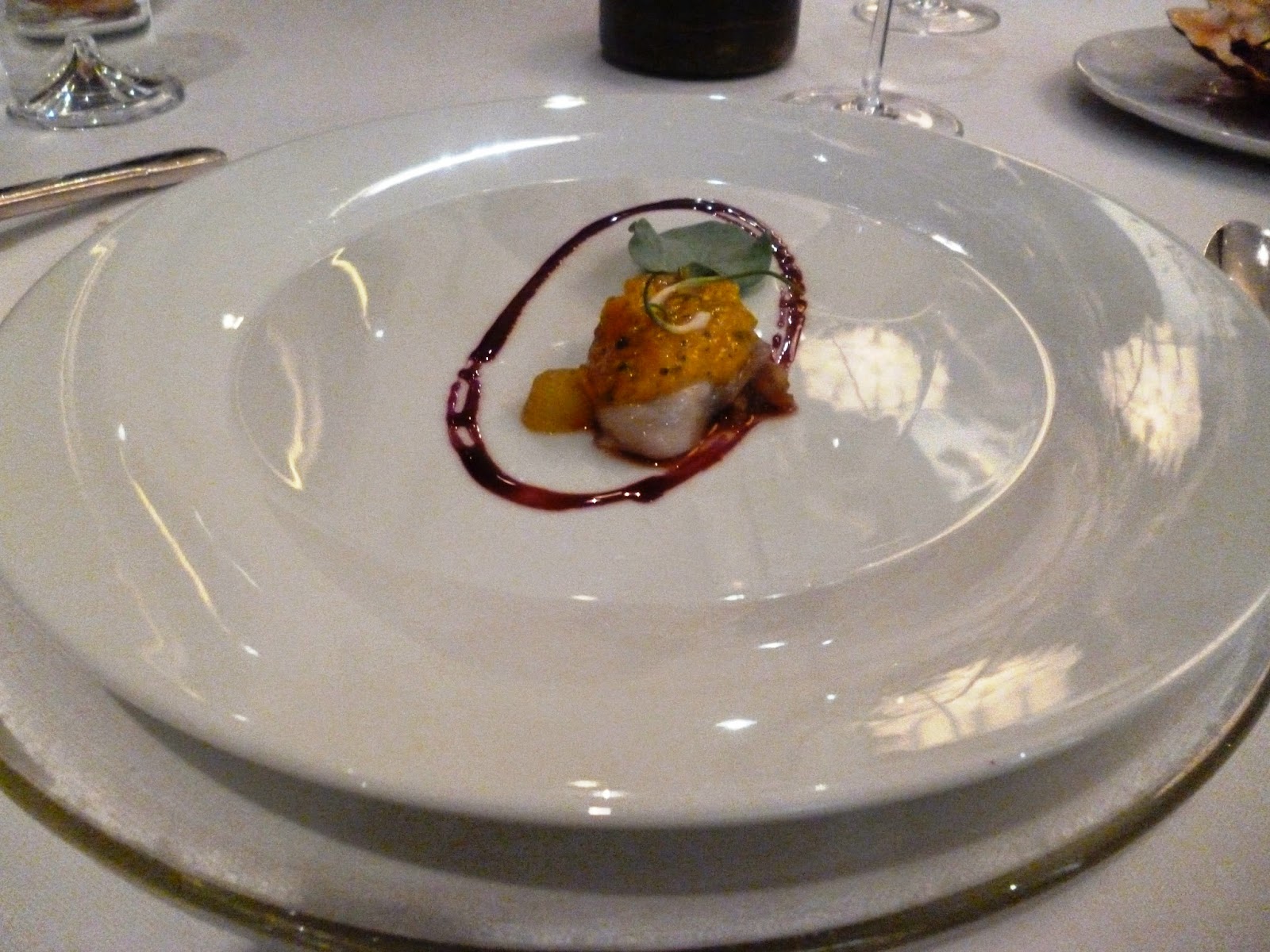 - A continuación, "Ensalada de habitas con cigala atemperada, gajo de pomelo explosivo". A mi parecer, las habitas demasiado duras y el gajo de pomelo explosivo, no estaba muy logrado. Lo que explotaba era una esferificación de sopa de marisco con la que se les había pasado el tiempo de esferificación y se quedó demasiado dura, al lado de un gajo de pomelo.