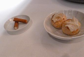 Antes de seguir con los platos principales, nos ofrecen pan, elaborado por el padre de Ramón Freixá y traído desde Cataluña y horneado en el restaurante. Entre la selección había pan de puerros, mostaza y ajo, mantequilla, chapata, de semillas, colín de aceitunas... los que probamos, riquísimos, con aceite de arbequina de Tarragona y mantequilla. A posteriori nos dimos cuenta del error cometido, porque nos inflamos a pan y luego no nos pudimos acabar el menú.