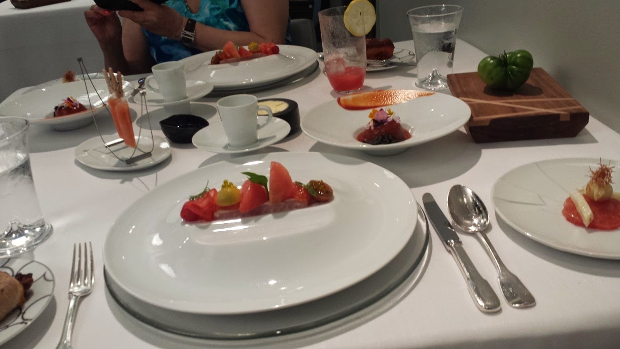 El estudio del tomate 2014: Conso-té con “xoofs” mediterráneos. Corazón rancio de tomate con cebollita rellena de idiazábal, hilos de carne y tallos de lechuga. Ensalada de muchos tomates y ventresca. Tomate asado con brasas de barricas de bourbon y toques florales y quemados. ***