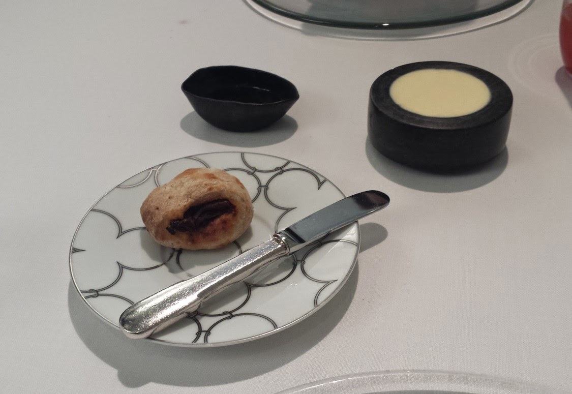 Judías al tenedor, butifarra dulce y jugo de espinacas. Brioche de tinta al vapor, fluido de foie, yema curada con chipirones. Pan “soufle” con romesco y vainas. *** Cochinillo confitado.