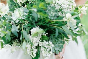 Elige diferentes tipos de verdes en diferentes tonalidades y combínalas con alguna flor en blanco, como por ejemplo eucalipto rojo, cinérea, hiedra, esparraguera, y rosas blancas.