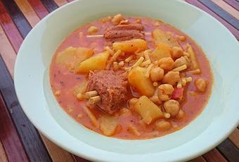 - A continuación, añadimos a la olla los garbanzos cocidos (si los quieres cocer tú, no te olvides de ponerlos en remojo la noche anterior) y las costillas descongeladas previamente o seitán troceado. Vertemos el vino, removemos y cubrimos todo de agua y cocinamos 5 minutos a fuego medio alto. Añadimos los fideos y cocinamos otros 5 minutos.