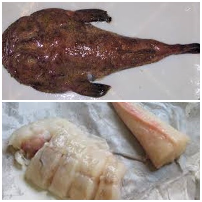 El rape común o rape blanco es el que más se comercializa y fisicamente se parece a un sapo... la cabeza es muy grande y la boca también, por ello se le da ese nombre.