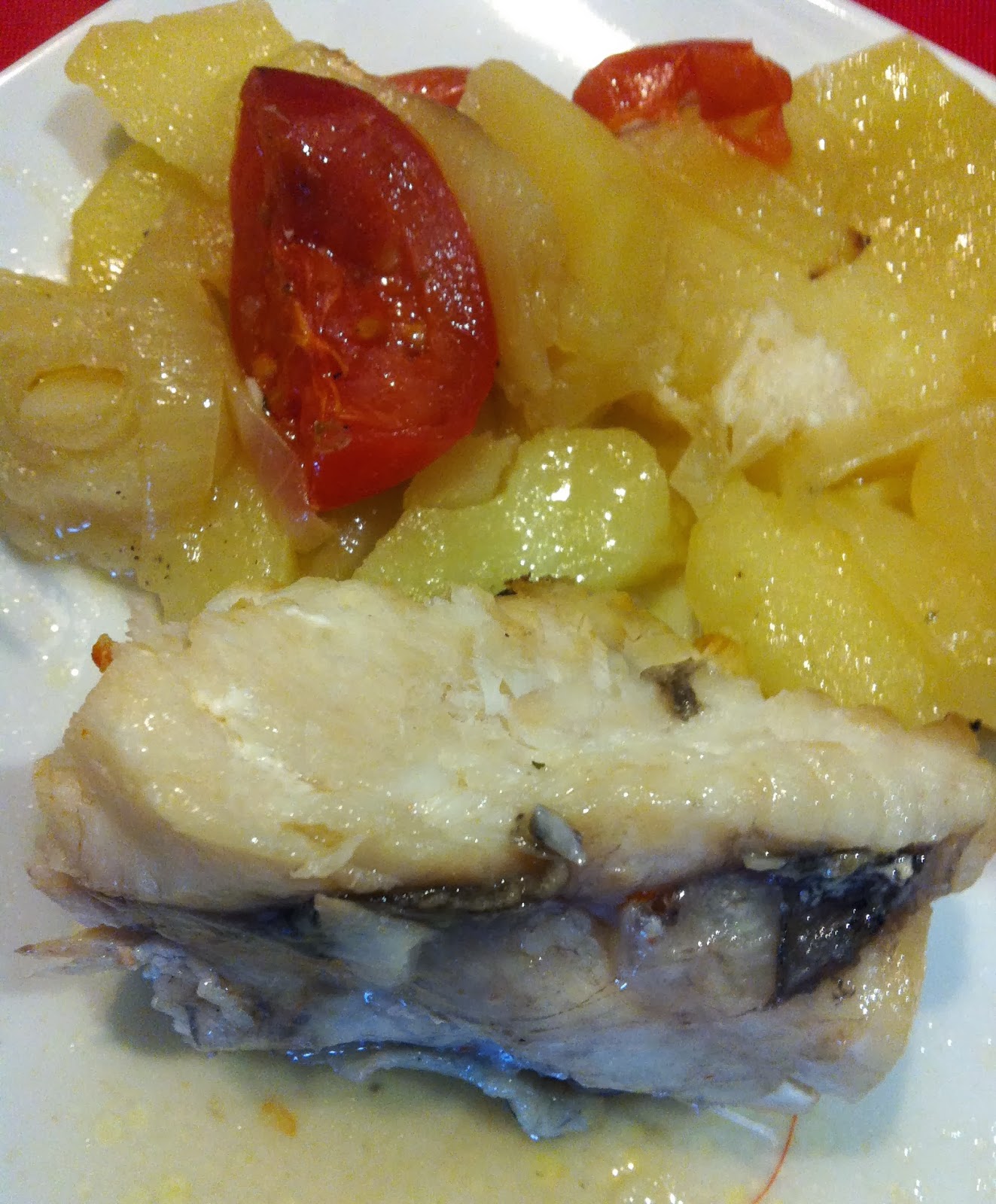 Sacar las verduras del horno y poner los lomos de rape en la fuente . Rociar con aceite de oliva y el caldo de verduras . Horneamos 15 minutos .