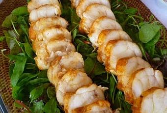 - En una fuente disponer un lecho de ensalada y encima, las rodajas de rape alangostado. Aliñar con una mezcla de aceite y vinagre de Módena.