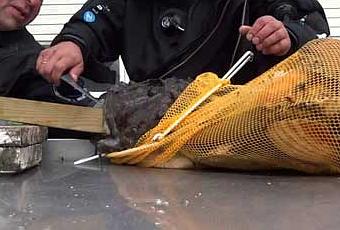 Un video subido a YouTube esta semana por un usuario de Rusia muestra a un buzo con la mano dentro de la boca de lo que parece ser rape. Él se duele, mientras él y otro hombre intentan forzar la apertura de las mandíbulas del pez con un tablón de madera y, a continuación, un cuchillo.