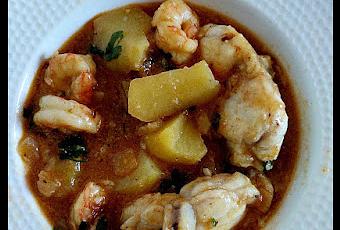 Cuando veamos que la patata la tenemos cocida incorporamos el rape y las gambas. Lo dejamos a fuego suave durante unos 4-5 minutos y listo.