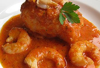 2 lomos gorditos de rape10 langostinos1 vaso de caldo de pescado hecho con la cáscara de los langostinos3 rodajas de pan de barra50 grs. de almendras crudas3 o 4 dientes de ajo1 cucharada sopera de tomate concentrado1 cucharada sopera de puré de pimiento choriceroperejilsal gruesa y aceite de oliva virgen