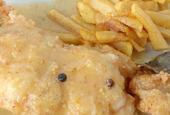 Salar el pescado, pasarlo por harina y freir los trozos en una sartén con abundante aceite de oliva bien caliente, de forma que quede forado por todos lados. Sacar de la sartén y dejar sobre papel de cocina a fin de que absorba el aceite sobrante.