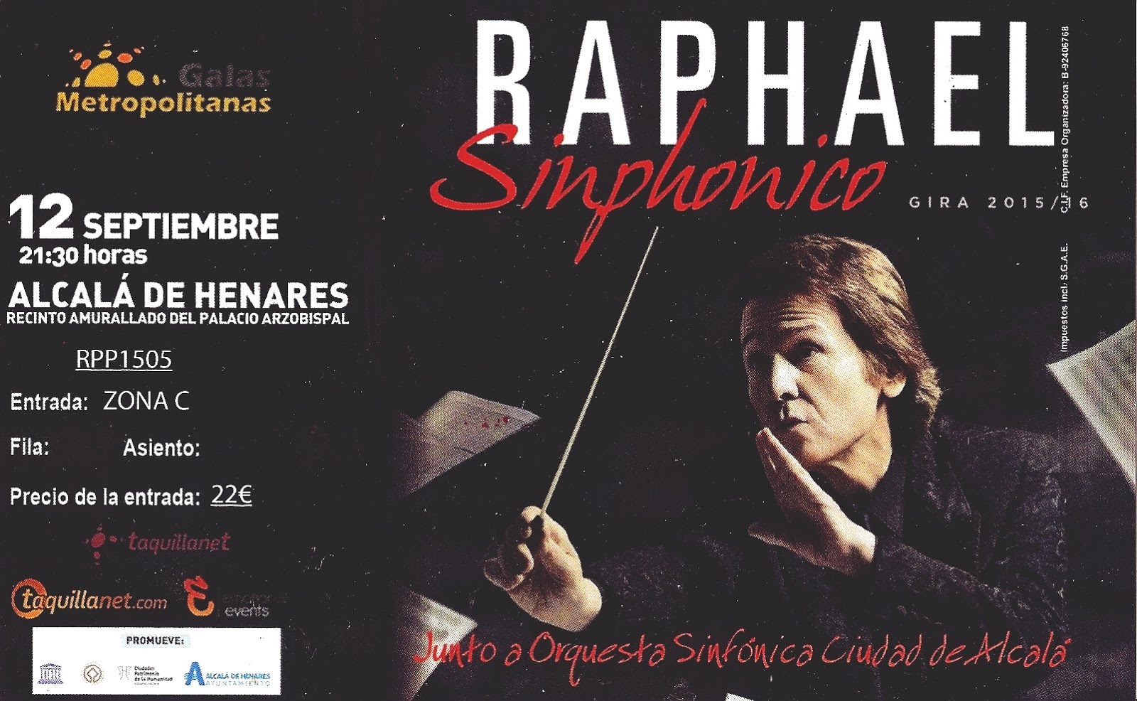 Mi entradita, guardada como oro en paño.A eso de la mitad del espectáculo la orquesta se tomó un pequeño descanso para dar paso a un pequeño bloque de canciones en las que la voz cantante -nunca mejor dicho- la iba a llevar Raphael, aunque acompañado en dos de ellas a piano y en las otras dos a guitarra. Fue entonces cuando la teatralidad, la expresión y las maneras de artista total hicieron acto de presencia. En "Por Una Tontería" y "Volveré A Nacer", desnudo de orquestación pero arropado por el piano de Rubén Díaz, Raphael nos abrió un par de páginas de su vida. Esas referencias a su niñez, esa copa vertida al suelo... Y es que un artista que se muestra al público, en realidad se muestra a su mundo. Los aires a folclore latino llegaron de la mano de "Gracias A La Vida" -composición original de la cantautora chilena Violeta Parra- y "Sombras" -de la poetisa mejicana Rosario Sansores-. La guitarra de Juan Guevara, la profunda carga emotiva de las letras y lo visceral en la interpretación de Raphael se conjugaron de tal forma que en mi opinión fue este uno de los mejores momentos de la noche.Tras la reafinación de la orquesta esperaba encontrarme en escena a Dave Mustaine y compañía pero no, ahí seguía incólume el bueno de Raphael. El guiño a los alcalaínos en "¿Qué Tal Te Va Sin Mi?" caló entre el público a ritmo de habanera o algo similar y enlazó con una gran versión del "Estuve Enamorado" para poner a la gente en pie. Entre medias sonó otra joya de la corona como "Detenedla Ya". La anoté rápidamente en la agenda pero mis oídos ya estaban al tanto del otro gran momento de la noche, que llegó con la dolorosamente bella "Amo Mío". Por muy grande que sea el corazón y nobles las intenciones, la distancia entre dos personas se puede hace insalvable... Eso nos lo hizo sentir con su voz y su talento interpretativo Raphael como nadie. La piel de gallina se me quedó durante largo tiempo.Con algunos requiebros vocales por aquí y por allá, el tramo final fue apoteósico: "Maravilloso Corazón" fue la "New York, New York" del momento, "Escándalo" -no digo nada porque todo el mundo lo sabe ya-, "Ámame", "Yo Soy Aquél" y "Como Yo Te Amo" pusieron punto final a la gala con el gentío dándolo todo, con Raphael crecido más que nunca pues su sueño se hizo realidad una vez más y conmigo boquiabierto.~Para finalizar solamente quiero decir dos cosas: La primera es que deseo de todo corazón por bien de nuestra cultura que Raphael siga dando clases magistrales muchos años más y la segunda, es dar las gracias a Paula y Marta -nuestras queridas sultanas y violinistas de la Orquesta Sinfónica Ciudad De Alcalá- por ayudarme con el set-list del espectáculo y por ser tan geniales ellas.