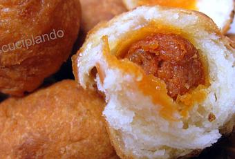 RECETA Ingredientes:- 1 taza de natas caseras- 2 tazas de leche- 1 c/c sal- 1 c/s levadura química- Harina - Aceite para freírlos- Relleno al gusto: chorizo troceado, dulce de manzana, queso,... .Preparación:Batimos la nata, añadimos la leche y la sal, removemos bien y vamos incorporando la harina junto con la levadura hasta conseguir una masa que no se pegue en las manos.Cogemos un trocito de masa, hacemos una bola e introducimos un trocito en este caso de chorizo, cerramos bien y a la sartén, donde los freiremos a fuego suave.Listos!!."CAPRICHO DE DIOSES... se preparan en un momento y la masa suave y esponjosa los convierte en unos bocados deliciosos. Con dulce de manzana también están muy ricos... ."