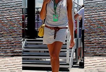 Raquel eligió para ese día un conjunto compuesto por un minivestido de algodón gris, cinturón de cuero caído, varios collares, maxigafas y sandalias-botín con hebillas en tono nude, muy parecidas a las que hemos visto a Sara Carbonero en varias ocasiones. El bolso amarillo parece un 2.55 de Chanel, pero en la imagen no se ve bien. Creo que Raquel sabe sacarse mucho partido, potencia sus largas y esbeltas piernas y luce un envidiable bronceado. vía