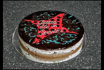 Bavarois de nata y chocolate 72% de cacao, decorado con chocolate blanco, chocolate negro 72%, y colorantes alimentarios.
