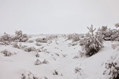 Según avanzaba el día y el ascenso, las condiciones climatológicas empeoraban considerablemente y llegó un punto en el que tuvimos que elegir entre seguir, confiando en el GPS, o dar la vuelta y retroceder por donde habíamos venido. Optamos por lo primero aunque la niebla era densa y la ventisca cada vez era más intensa, y así tuvimos unos kilómetros en los que fuimos a ciegas hasta llegar a la cima que fue justo donde se nos apagó el GPS por unos minutos. Afortunadamente el aparato reaccionó e iniciamos la bajada rápidamente, pues contábamos ya con pocas horas de luz, un trayecto que a mí se me hizo muy dificultoso por la tensión y porque bajamos en varios tramos campo a través por encima de matorral hasta conseguir llegar a la pista desde la que ya solo quedan 3 o 4 kilómetros de camino fácil. Se nos hizo de noche a unos 300 metros del final pero acabamos sin problemas la ruta sanos y salvos en el punto de inicio donde nos esperaba un maletero de coche lleno de comida y bebida para reponer fuerzas.