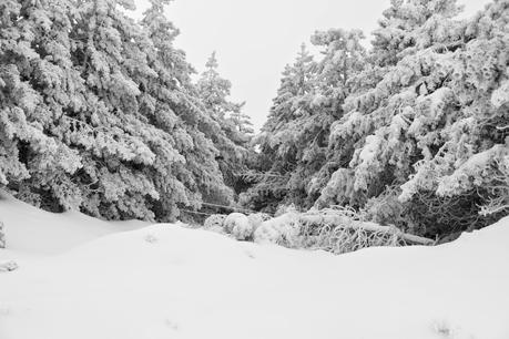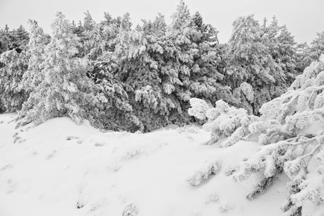 El día amaneció soleado y sin viento. Al poco de llegar al pueblo de Somosierra empezamos a ver las primeras nubes. A la mitad de la ruta, en la cumbre, ya solo se veía una nube, bueno, no se veía, se sentía, porque estábamos dentro de ella y ver, lo que se dice ver, no se veía nada. La subida a la Peña Cebollera o Pico de las Tres Provincias que hicimos es una ruta circular de dificultad moderada de poco más de 16 kilómetros que con buenas condiciones meteorológicas se hace en unas cuatro horas aunque nosotros tardamos bastante más. Salimos desde el mismo pueblo de Somosierra, desde la gasolinera que hay en la antigua N-I y a partir de esta nos dirigimos a las cascadas del Chorro de los Litueros, el salto más grande y con mayor caída de la Comunidad de Madrid que cuando se une al arroyo de las Pedrizas se convierte en el nacimiento del río Duratón. Se llega allí por un camino fácil sin señalizar de algo más de un kilómetro y ya desde este punto iniciamos la subida, al principio en paralelo con la autopista A1, por pistas, caminos o cortafuegos, con varios tramos de fuerte pendiente, hasta la cumbre del Pico de las Tres Provincias a 2129 metros de altitud donde confluyen los límites de las provincias de Madrid, Segovia y Guadalajara. En este primer tramo, donde al principio dudábamos si llegaríamos a ponernos las raquetas pues no veíamos mucha nieve, el paisaje se me iba tornando cada vez más precioso, tanto que decidí cambiar las gafas de montaña por mis gafas de sol graduadas, no quería perderme tanta belleza, ni tampoco caerme más.