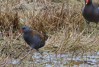 El rascón aparece junto a una gallineta común, permitiendo apreciar su diferencia de tamaño y forma
