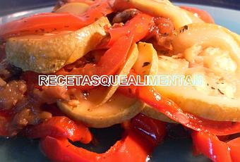 Cuando la cebolla cambie de color, momento en el que ya está blanda, incorporamos formando capas y por este orden, el pimiento rojo cortado en aros, la berenjena, los calabacines y los tomates cortado todo en rodajas.