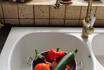 Cortamos en dados el pimiento, la berenjena, el tomate y el calabacín. La cebolla la picamos más pequeña, y el ajo muy fino también.