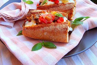 Los que me conocen saben que no soy de coger un trozo de pan con cualquier cosa dentro, por lo general me tomo mi tiempo para decidir lo que voy a poner en el plato. Muchísimas veces opto por el pan con tomate, ligeramente tostado, con un chorrito de aceite de oliva virgen y unas lonchas de buen jamón bien finas para poder degustarlas mejor. No solo porque lo tengo como cultura sino porque me encanta de ese modo. Pero muchas otras veces opto por los bocadillos calientes o las tostas para comer con cuchillo y tenedor. Me rechifla la morcilla de arroz con pisto en panecillo y si es de Aragón más porque las hacen muy ricas. Esta vez he rellenado el pan con una rica ratatouille con mozzarella condimentada con unas hojas de albahaca fresca que le dan un sabor inmejorable.